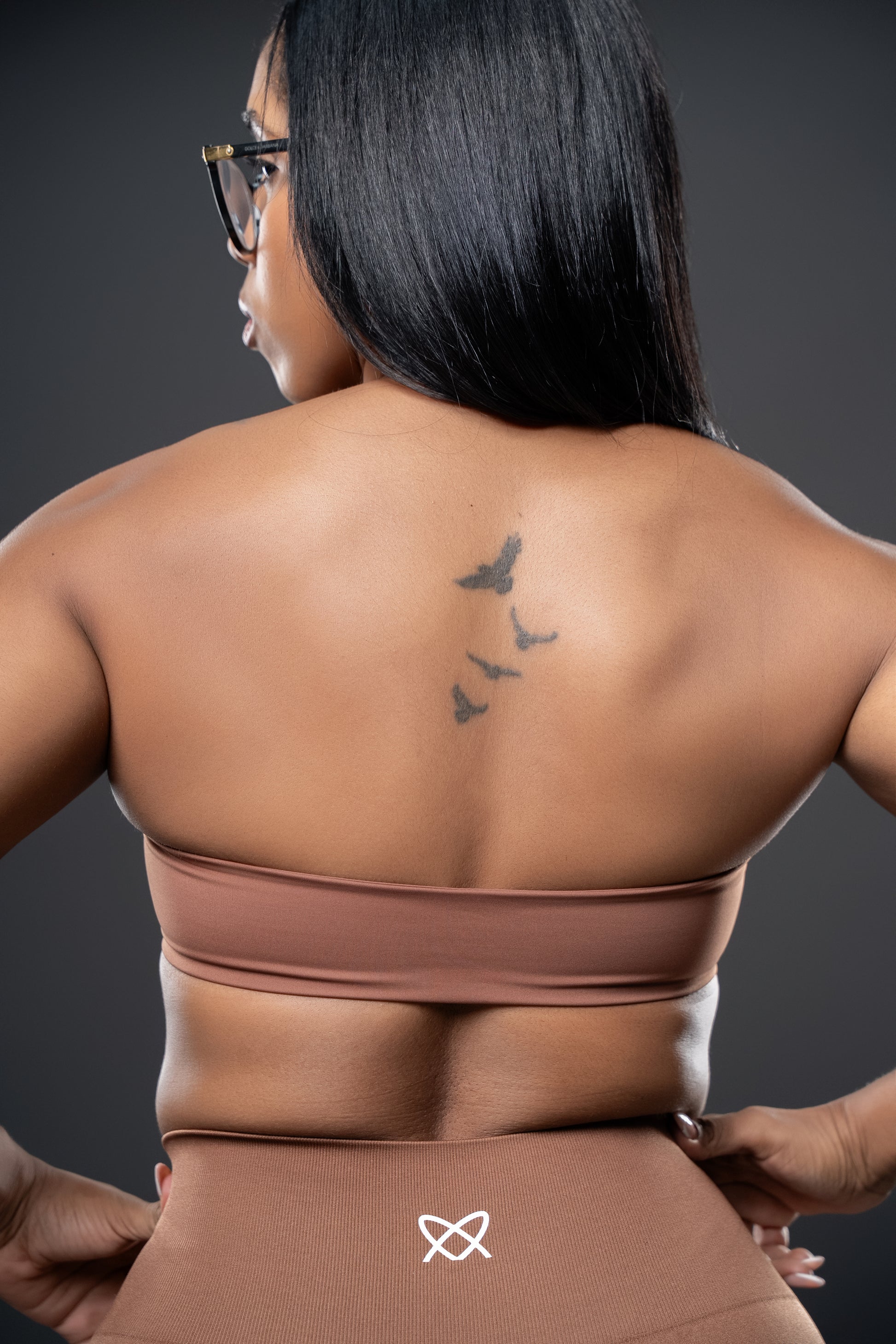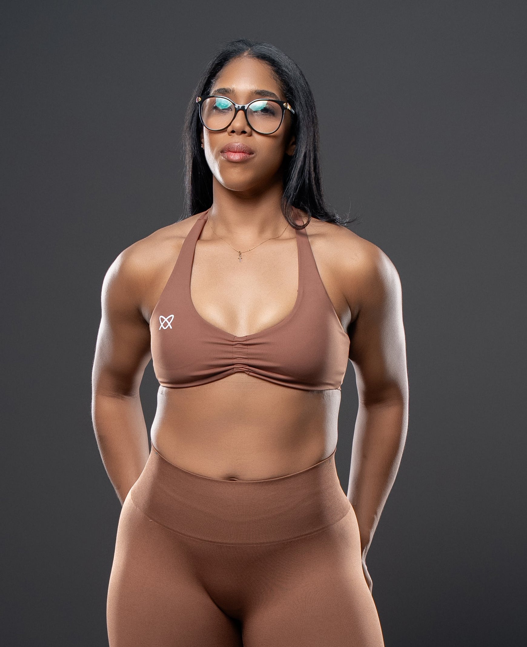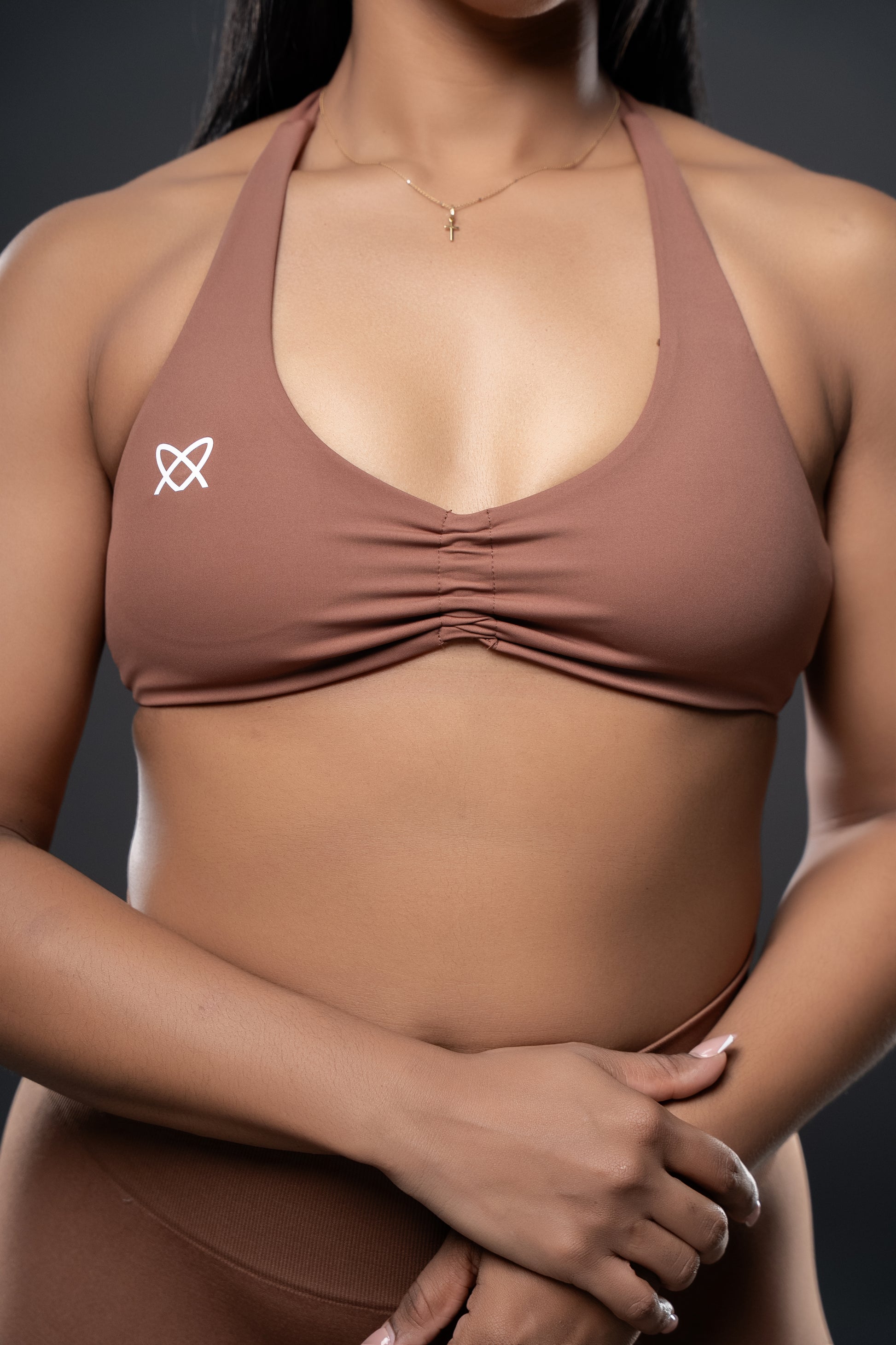 El Axia Top es una oda a la fuerza digna y silenciosa de la mujer. Su diseño con escote halter y fruncido central resalta la figura sin sacrificar soporte ni movilidad.