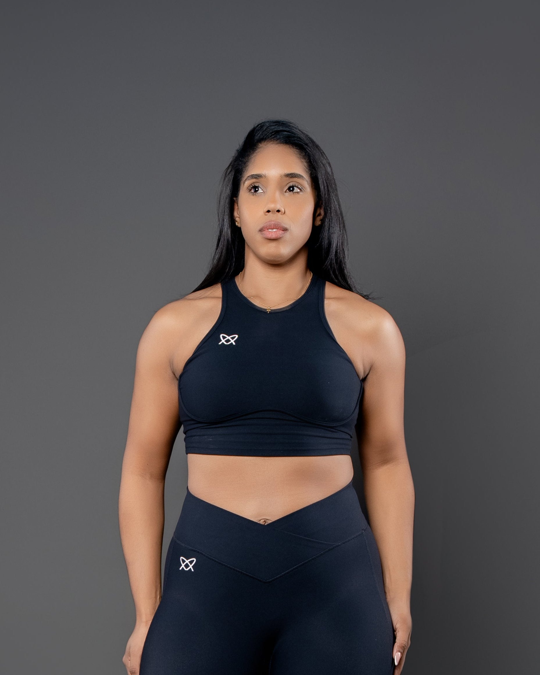 El GaiiaTop está diseñado para quienes entrenan con propósito y presencia. Su silueta de escote alto estiliza y ofrece una cobertura segura, mientras el diseño ajustado realza el torso de forma cómoda y elegante.